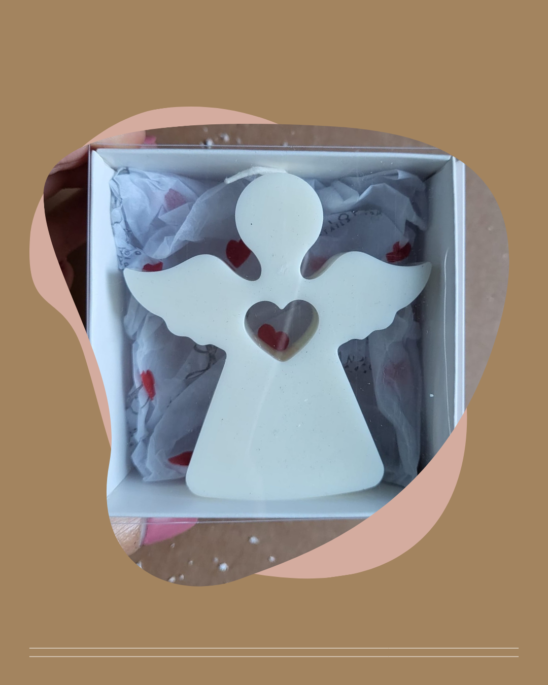 👼 Velas em formato de anjo, feitas em cera de soja ecológica, com acabamento artesanal e fragrância suave.